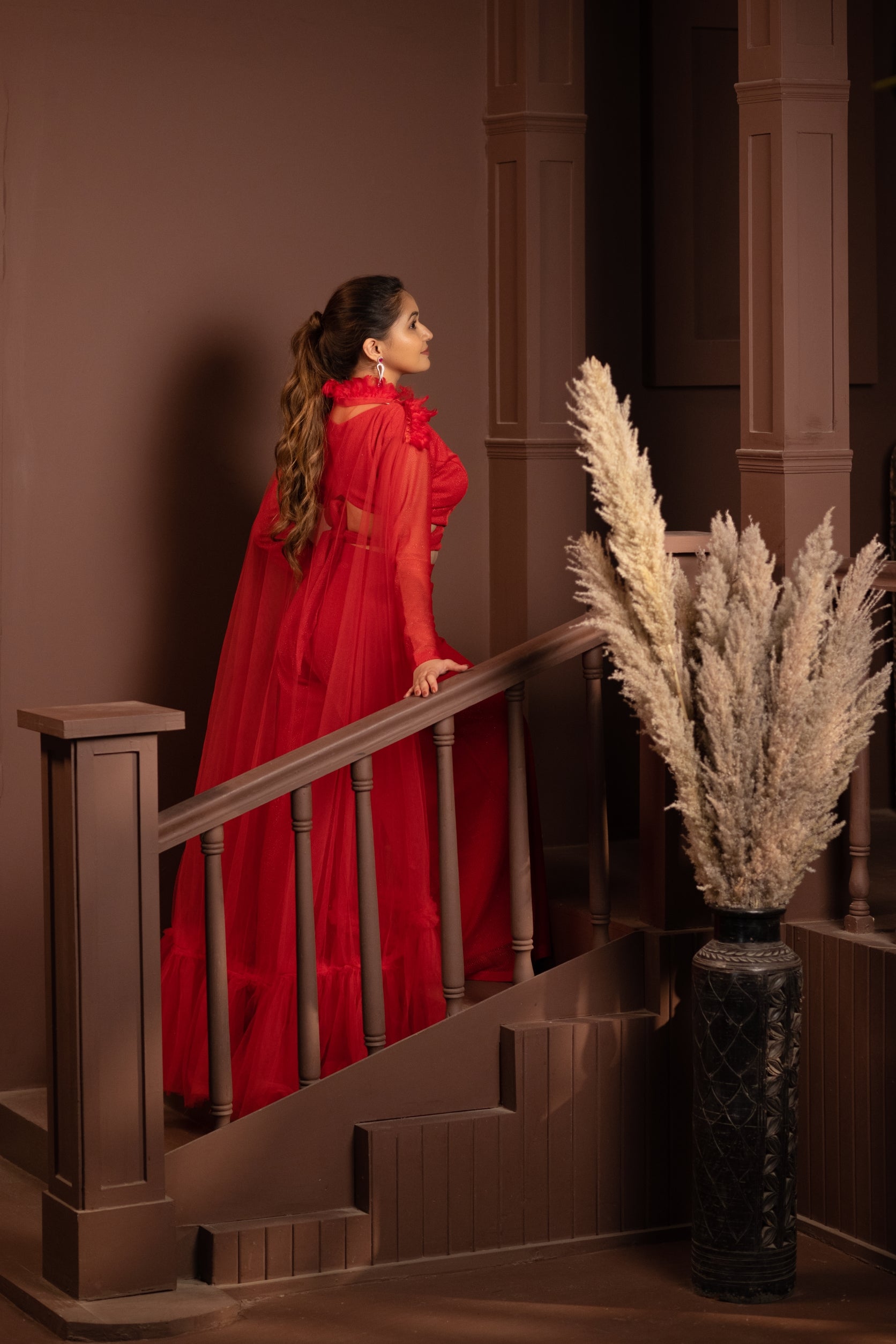 The "Cape of Elegance in Royal Red" is a true symbol of opulence and style. The regal red hue commands attention, while the intricate feathered detailing on the cape adds a touch of drama and intrigue.