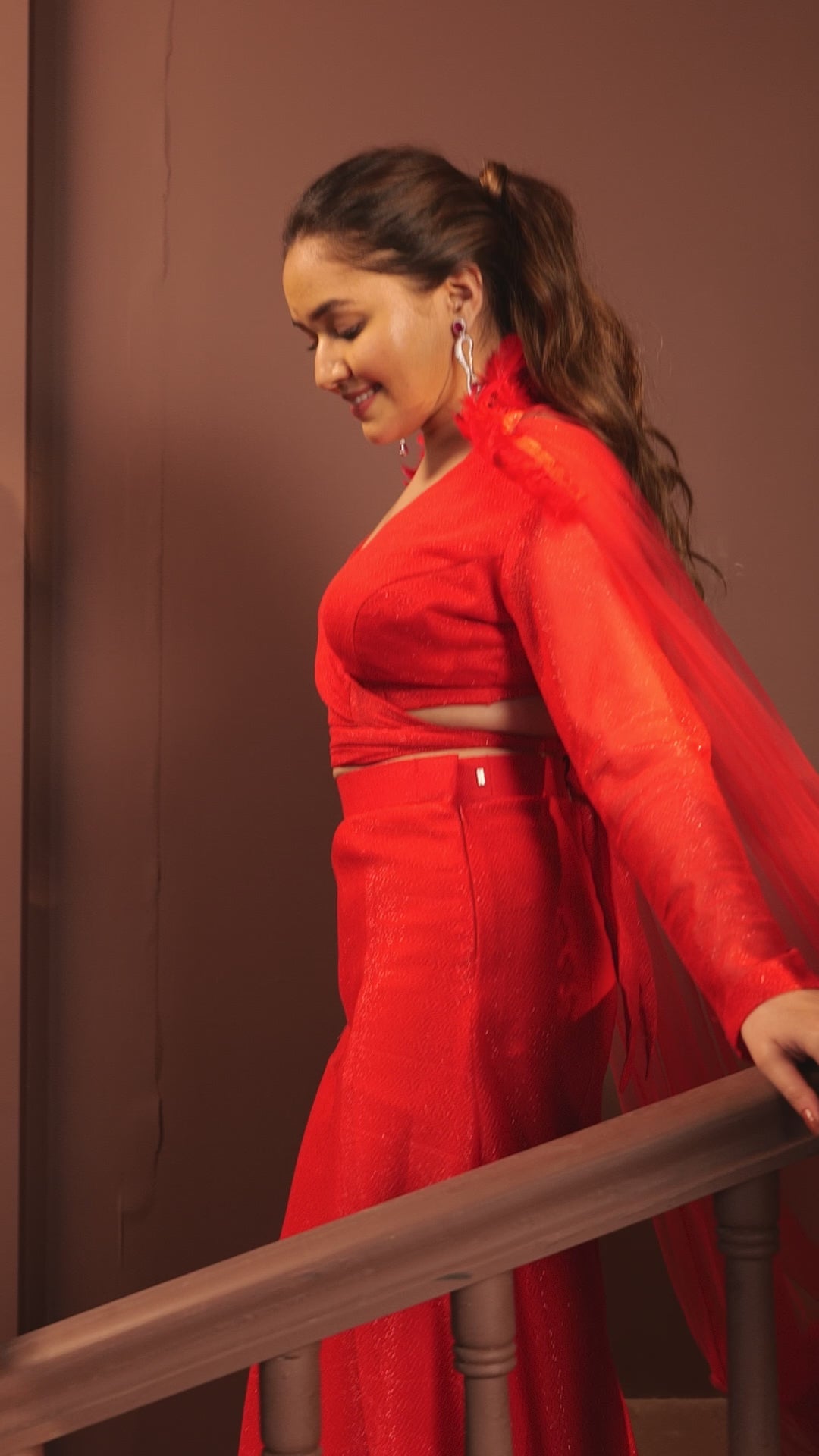 Introducing our exquisite "Cape of Elegance in Royal Red" ensemble, a mesmerizing blend of sophistication and allure. This captivating co-ord set features a stunning royal red outfit complete with a designer cut blouse and a dramatic feathered cape.