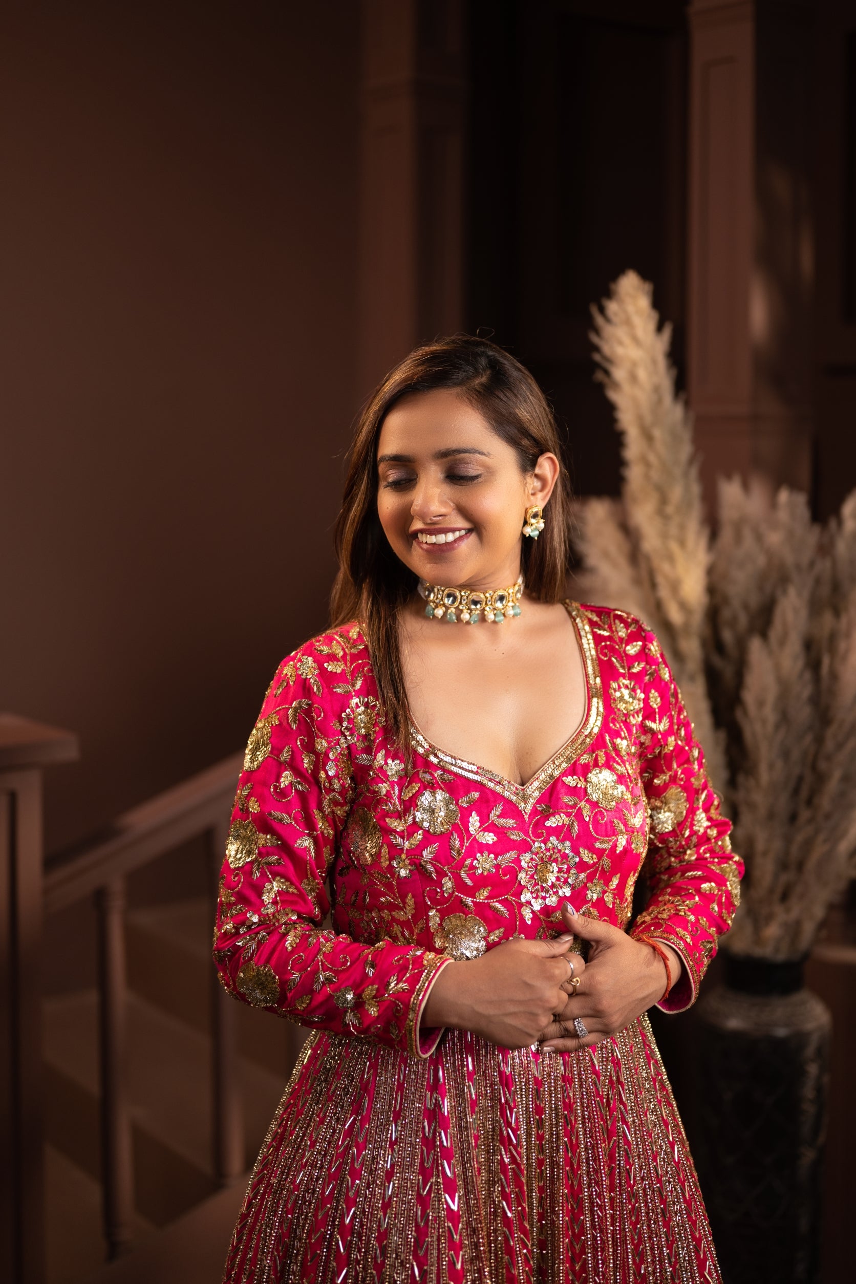 Immerse yourself in the allure of this luxurious pink silk gown, meticulously adorned with delicate hand embroidery. Each stitch is a testament to the artisan's skill and attention to detail, creating a breathtaking masterpiece that is sure to turn heads.