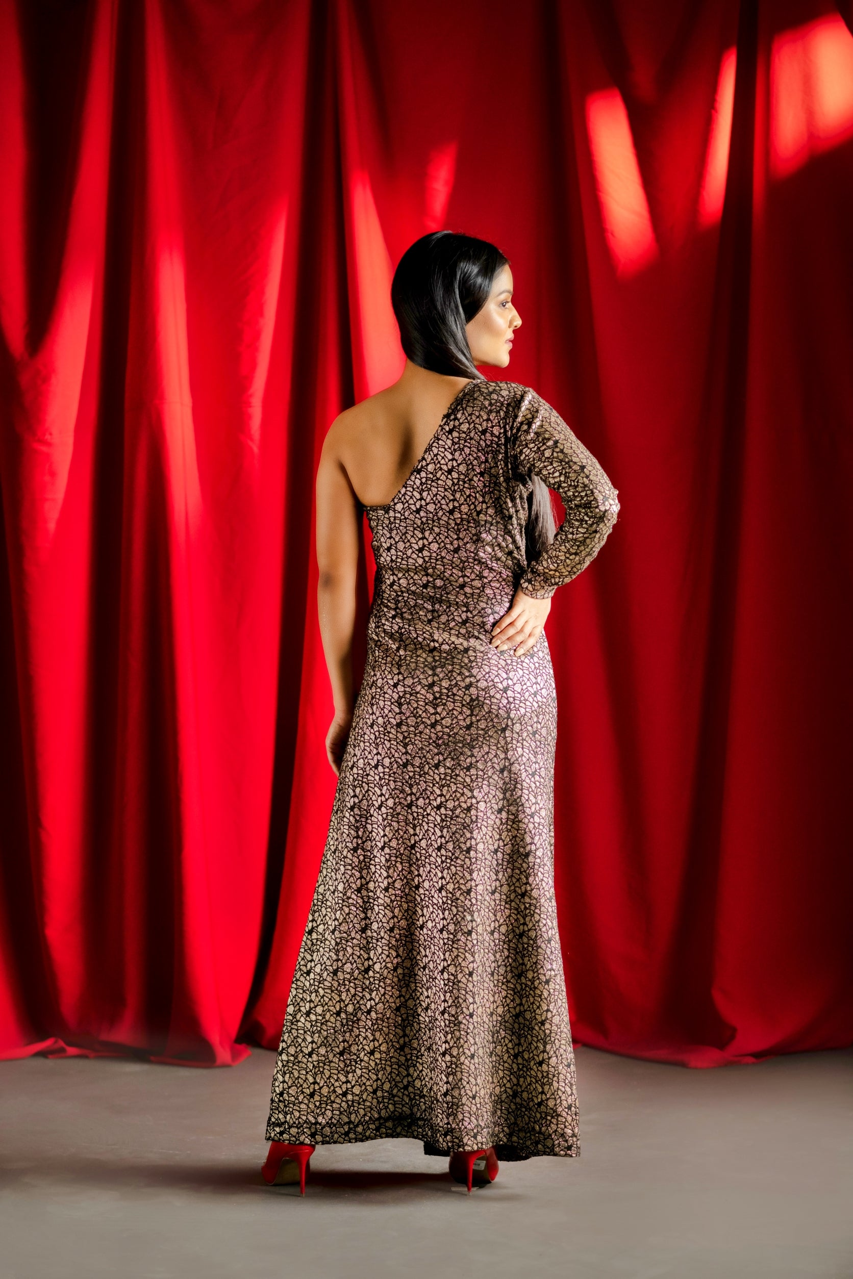 This stunning two-piece gown features a sleeveless black bralette with a one-shoulder overall, paired with a floor-length, full gold glitter gown. The gown features a thigh-high slit to showcase a hint of leg as you walk.