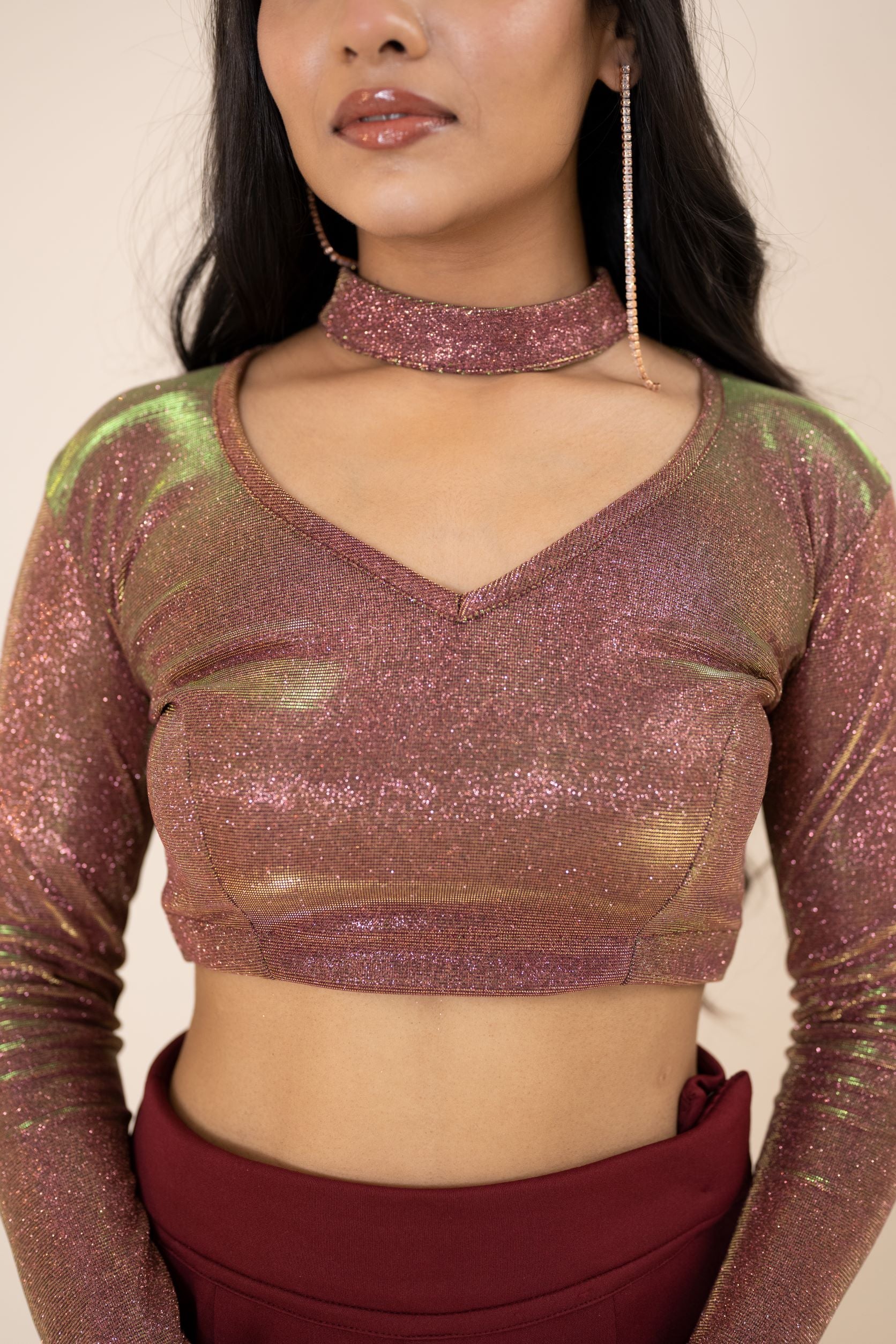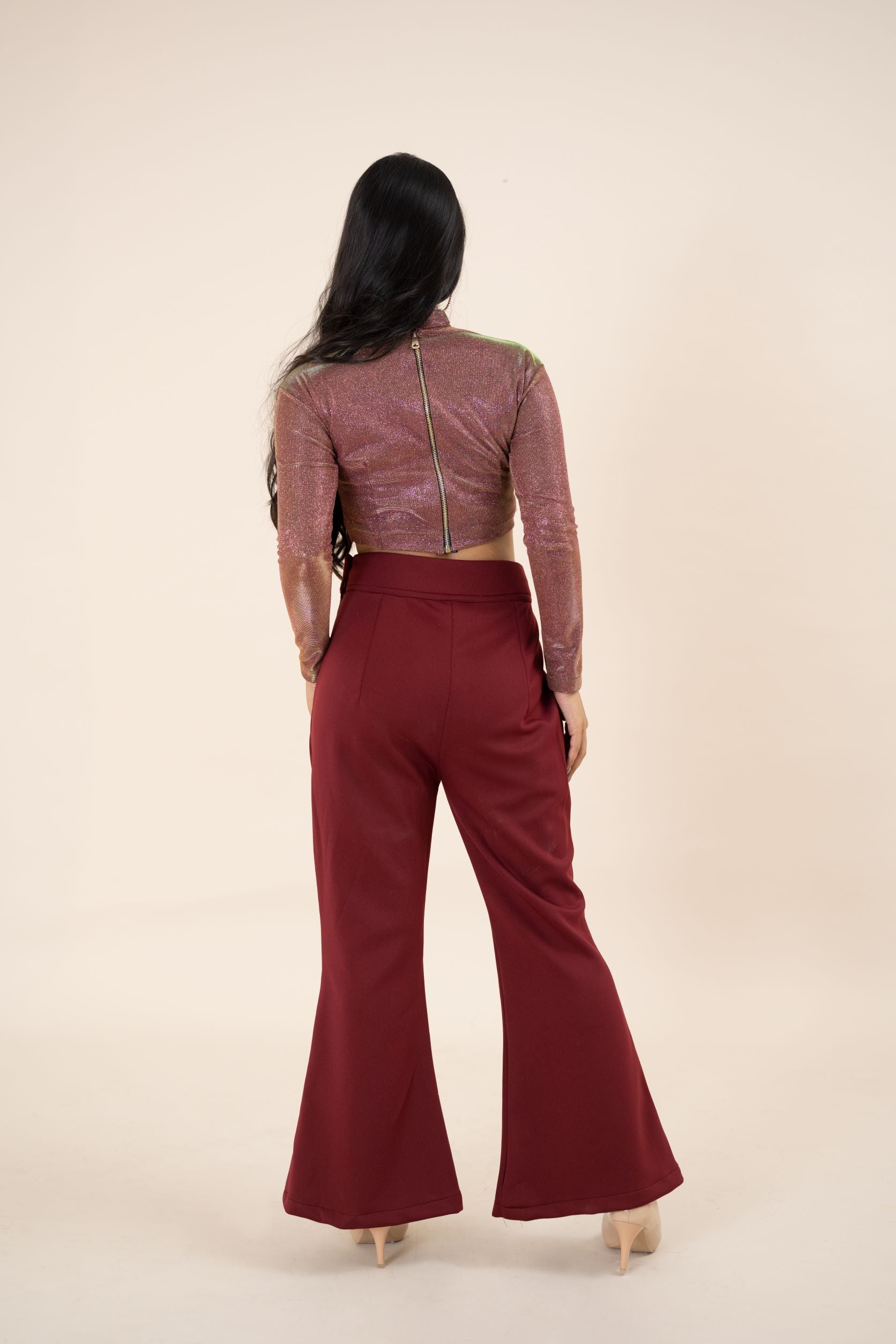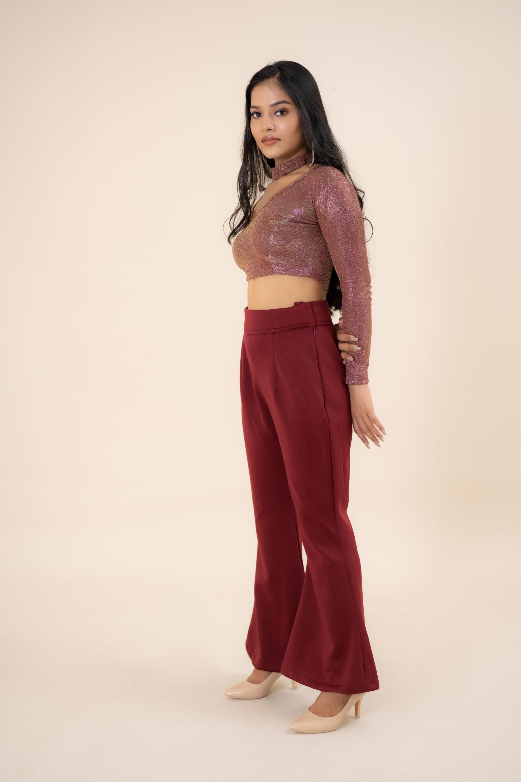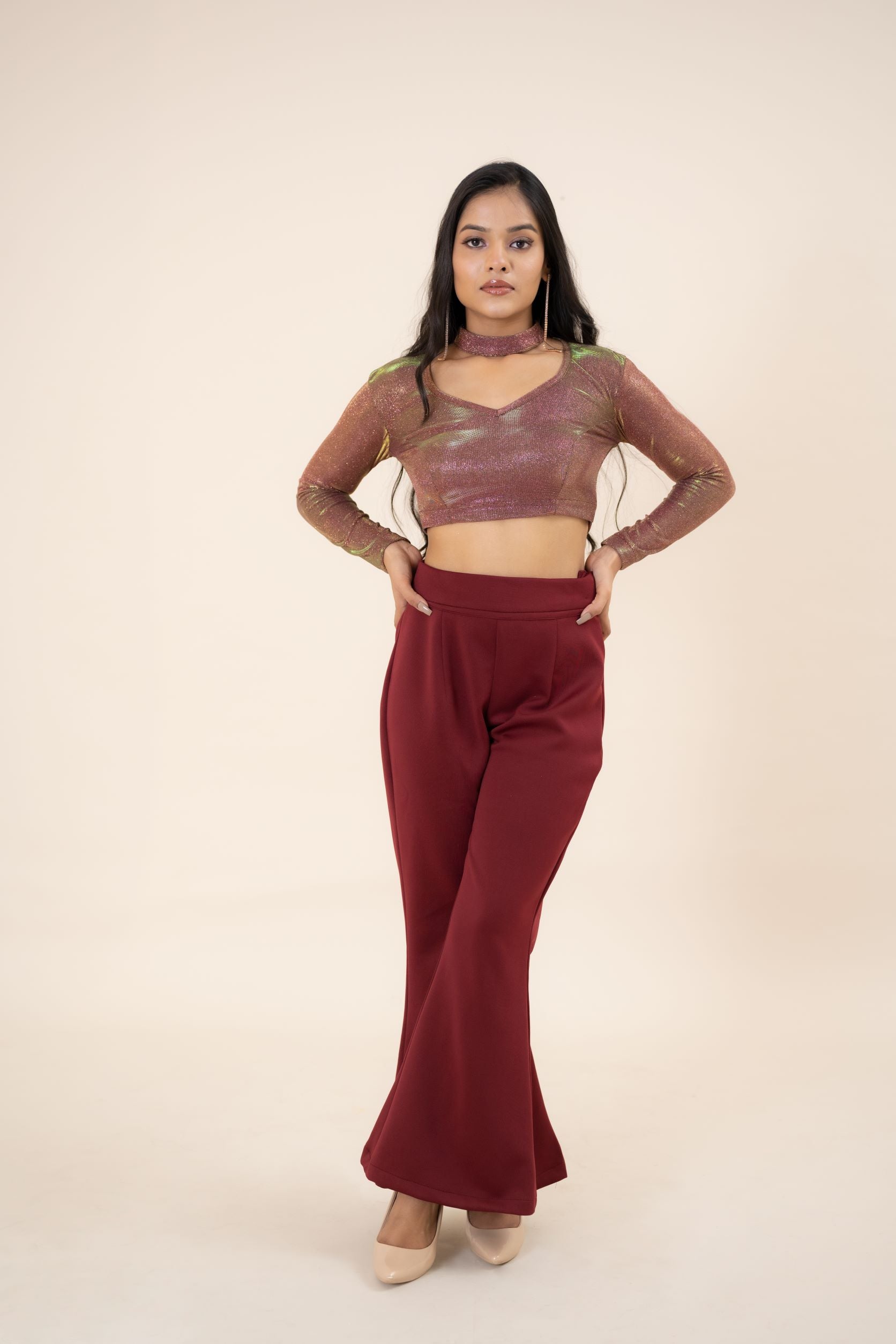 This co-ord set has a shimmering crop top with a devilish choker. It comes along with a retro bell bottom pants which makes this whole set "A Perfect Party Outfit".