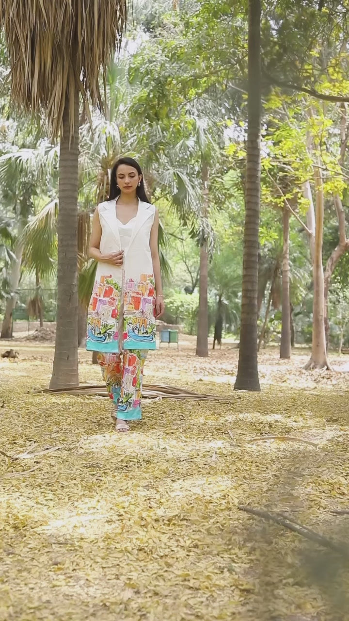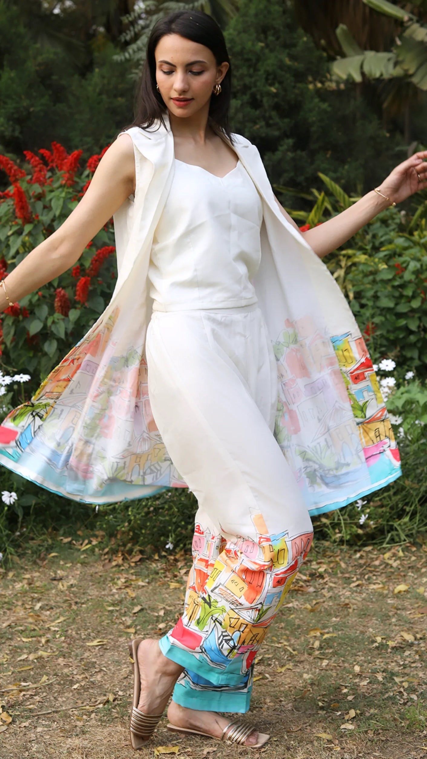 Introducing Vogue Chic from our Verve Collection, a versatile 3-piece set designed for the modern woman seeking effortless style and comfort. Crafted from cream-based linen fabric, this ensemble features wide-legged pants, a stepped top, and a cut-sleeve collared jacket.